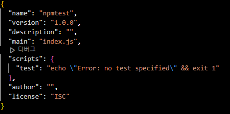 위에서 만든 'package.json' 파일은 다음과 같다.